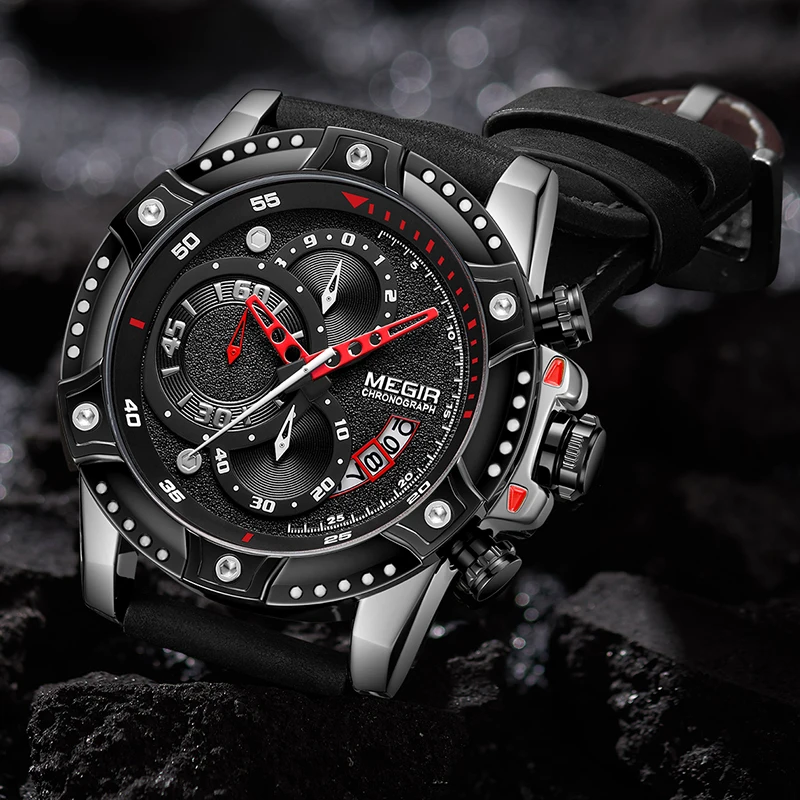 MEGIR Men's Big Dial Watch Fashion Chronograph Sports Quartz Wrist Watch Men Leather Casual Waterpr