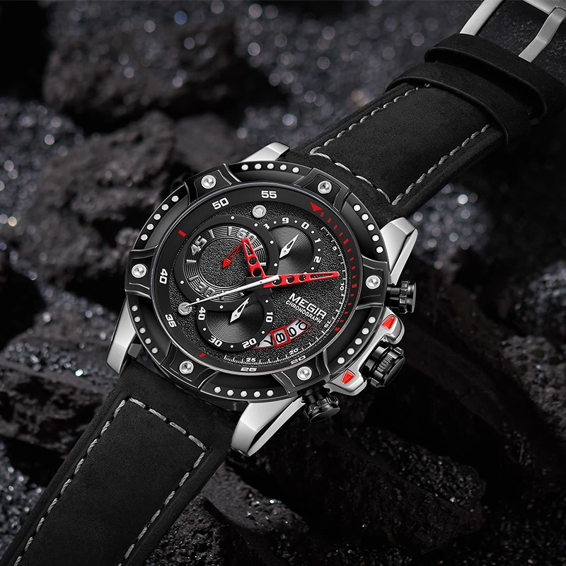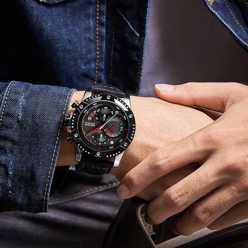 HIGH QUALITY MEGIR Men's Big Dial Watch Fashion Chronograph Sports Quartz Wrist Watch Men Leather Casual Waterpr